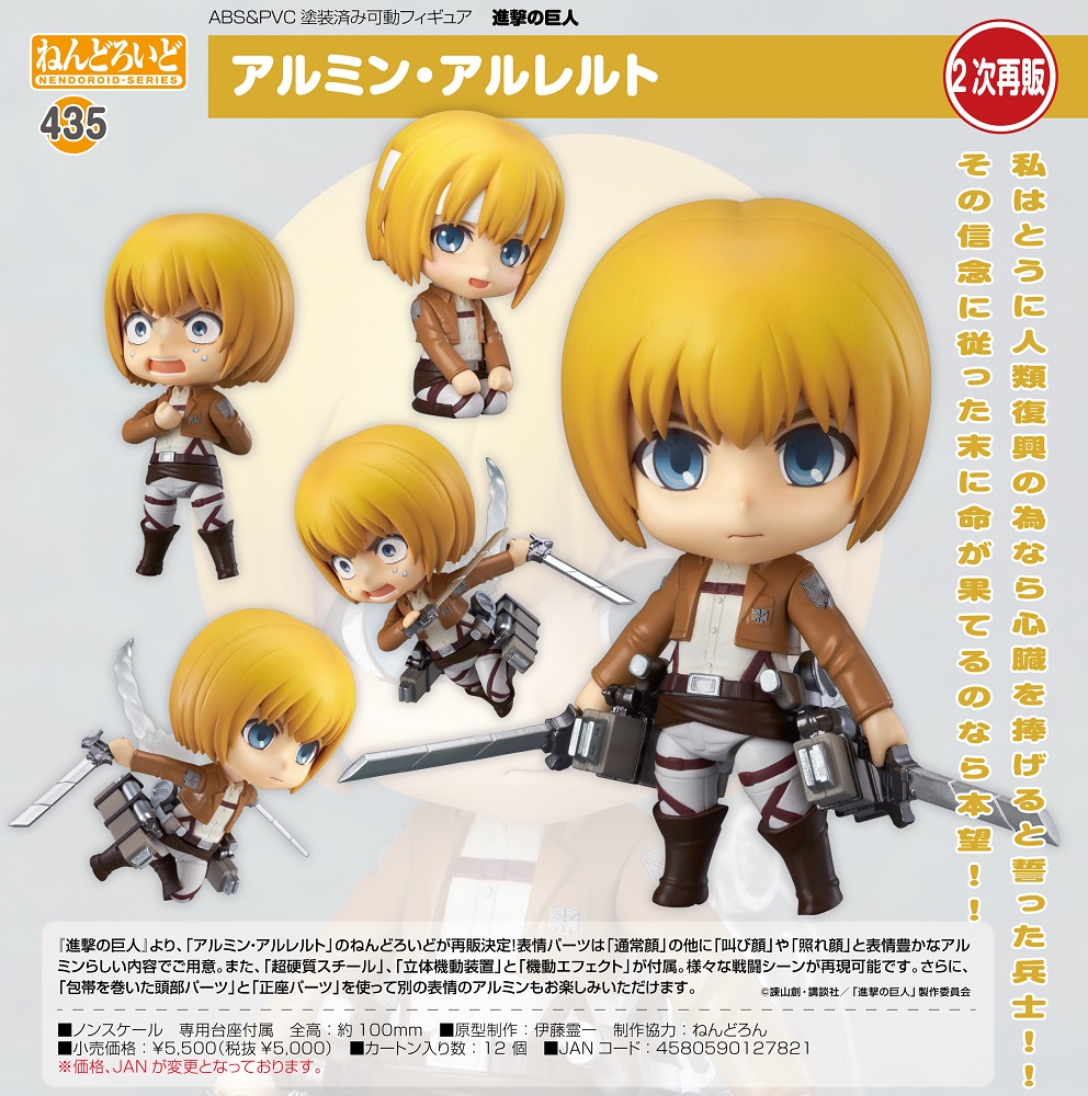 Importado de Japón, figura original de la marca Good Smile Company, Nendoroid Amrin Arlet, de la popular serie Ataque a los titanes. Esta figura estilo chibi, nos muestra a Armin en todo su uniforme de la Legión de Exploración, con varios accesorios, partes y rostros intercambiables para que puedas recrear todas tus poses favoritas, ayudado por su base para exhibición. ¡Completa tu colección con Eren y Mikasa!